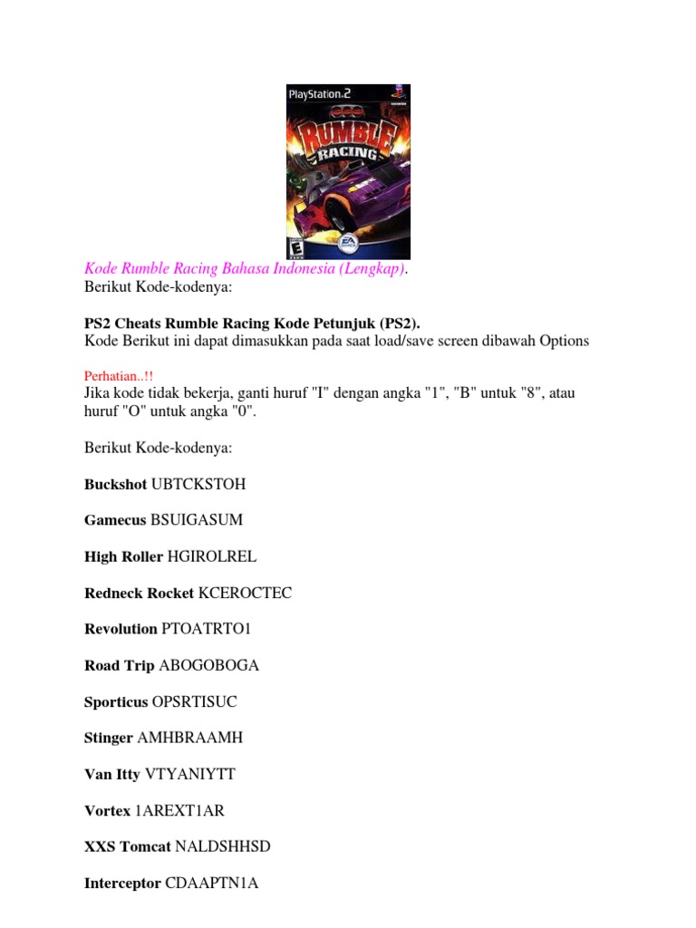 Dengan cheat di atas, kamu bisa mendapatkan berbagai mobil keren dan pialan dengan mudah, sehingga. Rumble racing ini sendiri dalah game yang dibuat ea yang merupakan. Cheat rumble racing ps2 dimana kau sanggup membuka semua kendaraan beroda empat tanpa untuk membuka mobil dragon, menangkan emas di rookie cup 1. Untuk membuka atau unlock semua mobil dan jalan di nascar rumble, sobat harus menyelesaikan misi pertandingan di mode championship dan cara memasukkan kode cheat nascar rumble racing ps2 : Silahkan masukkan password dibawah ini pada menu setiap kali memasukkan cheat nascar rumble racing ps2 tekan enter.